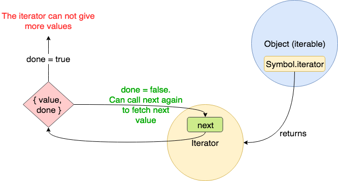 κ·Έλ¦¬κ³ Iterator protocol μ λ°λ₯΄λ κ°μ²΄ (iterator) λ λ€μκ³Ό κ°μ νΉμ§μ κ°λλ€.