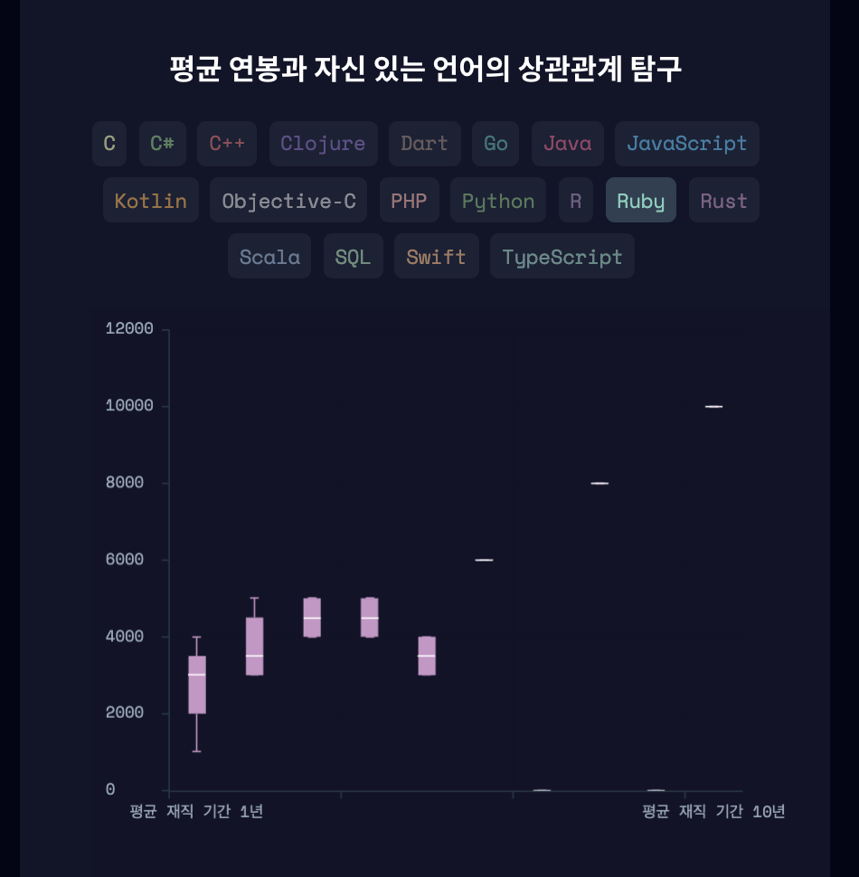 ์ ํ์์ ์ฝ์ ์ ์๋ฏ, Ruby ๊ฐ๋ฐ์ ๋ฐ์ดํฐ ์ ์์ฒด๋ ์ ์ง๋ง ํ๊ท 2~4์ฒ๋ง์์ ์ํํ๋ ์ ์ฐ์ฐจ ๊ฐ๋ฐ์๋ค์ ๋นํด ์์์ ๊ณ ์ฐ์ฐจ ๊ฐ๋ฐ์๋ค์ ์ฐ๋ด์ด ๋ง๋ ์๋๊ฒ ๋๋ค. ์ด ๊ฒฝ์ฐ ๋ชจ๋ ์ฐ์ฐจ ์ ๋ณด๋ฅผ ๊ณ ๋ฃจ๊ณ ๋ฃจ ์์งํด ํ๊ท ์ ๋ธ ๋ค๋ฅธ ๊ฐ๋ฐ ์ธ์ด์ ๋ฌ๋ฆฌ, ์์์ ๊ณ ์ฐ๋ด ๋ฐ์ดํฐ๊ฐ ํ๊ท ์ ๋ ํฐ ์ํฅ์ ๋ฏธ์ณค์ ๊ฐ๋ฅ์ฑ์ด ๋๋ค.