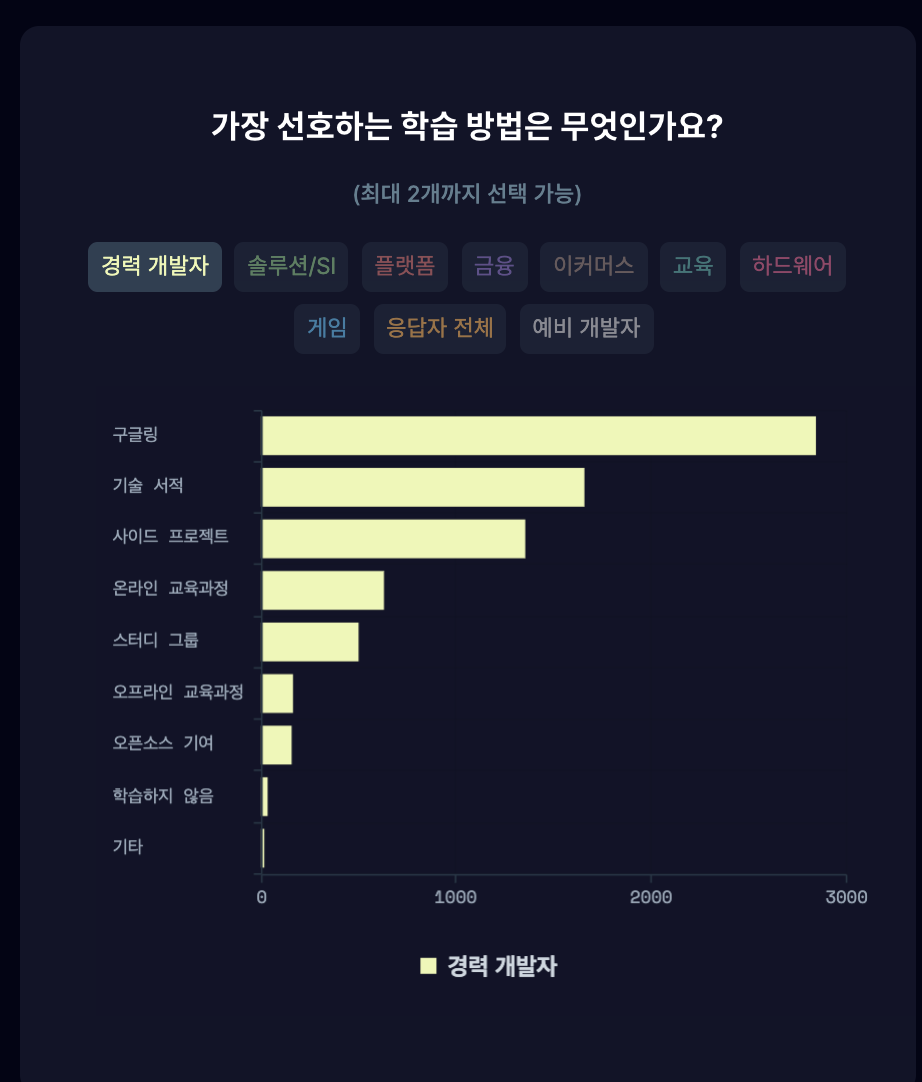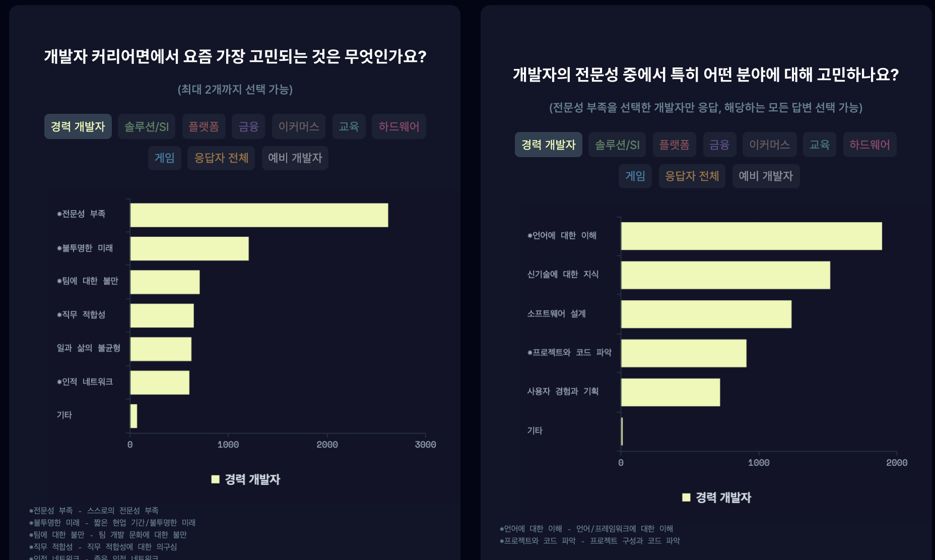 ์ด์ด์ง ์๋ต ๊ฒฐ๊ณผ๋ฅผ ๋ณด๊ณ ์ ํํ ์ด๋ค ์ ์์ ๊ฐ๋ฐ์๋ค์ด ์ ๋ฌธ์ฑ์ ๊ณ ๋ฏผํ๊ฒ ๋๋์ง ์กฐ๊ธ ๋ ์ ์ถํด๋ณผ ์ ์์๋ค. ์๋ต ์๊ฐ ๊ฐ์ฅ ๋์๋ ์ฐจ๋ก๋ก "์ธ์ด์ ๋ํ ์ดํด"์ "์ ๊ธฐ์ ์ ๋ํ ์ง์"์ธ๋ฐ, ์ด ๋์ ์ฌ์ค ์ ๊ธฐ์ ์ผ๋ก ์ฐ๊ฒฐ๋์ด ์๋ ๊ฒ ๊ฐ๋ค.