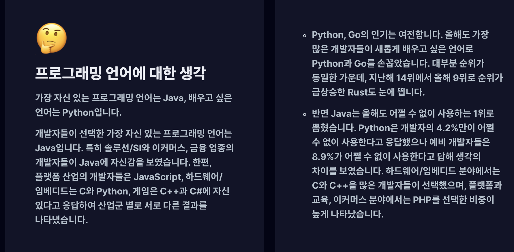 ๋ค์์ ๊ฐ๋ฐ์๋ค์ด ์์ ์๋ ์ธ์ด๋ก Java ๋ฅผ ์ ํํ๊ณ ๋ฐฐ์ฐ๊ณ ์ถ์ ์ธ์ด๋ก Python ์ ์ ํํ ์ด์ ๋ ์ฌ๋ฌ ์๋ฏธ๋ก ์ฌ๋ฐ๋ค๊ณ ์๊ฐํ๋ค. ํด์ธ์์๋ ์ฐ๋ฆฌ๋๋ผ์์๋ "Java ๋ ์ฃฝ์ด๊ฐ๋ ์ธ์ด"๋ผ๋ ์ธ์์ด ๊ฝค ๊ตณ๊ฑดํ ๊ฒ์ผ๋ก ์๊ณ ์๋๋ฐ, ์ด๋ ๊ฒ ๋ฐ์ดํฐ๋ฅผ ๋ณด๋ค๋ณด๋ฉด ์์ง ์ค๋ฌด์์๋ Java๊ฐ ๋๋ฆฌ ์ฐ์ด๊ณ ์๋ค๋ ์ฌ์ค์ ํ์ธํ๊ฒ ๋๋ค. (์ฐธ๊ณ : Top 20 Most Popular Programming Languages For 2021 and Beyond) ์ฐ๋ฆฌ๋๋ผ์์๋ ๋ฐฑ์๋๋ ์๋ฒ ์ชฝ์์ ์ปค๋ฆฌ์ด๋ฅผ ์์ผ๋ ค๋ฉด ํ ๋ฒ์ฏค์ Java ๋ฅผ ๊ฑฐ์น๊ฒ ๋๋, ์ด์ชฝ์ ์๊ฐํ๋ค๋ฉด ๋ฏธ๋ฆฌ ๋ฐฐ์๋๋ ๊ฒ ๋์์ง ์๊ฒ ๋ค๋ ์๊ฐ์ด ๋ค์๋ค.