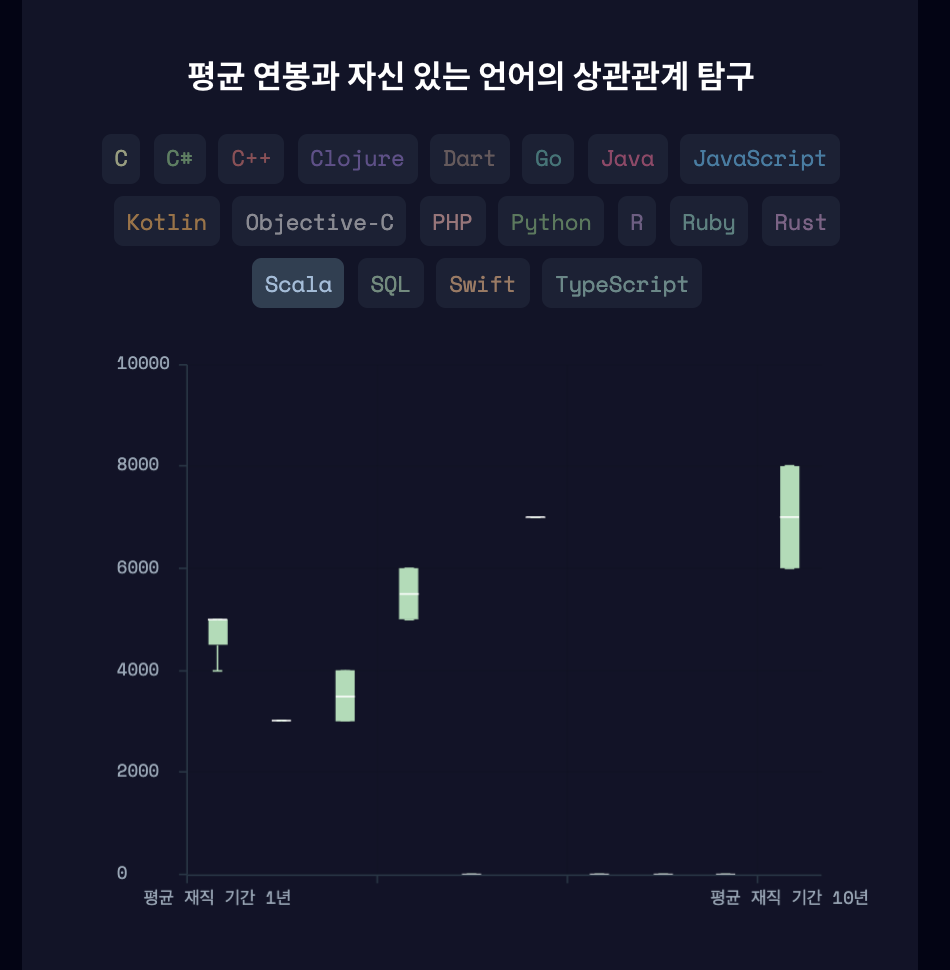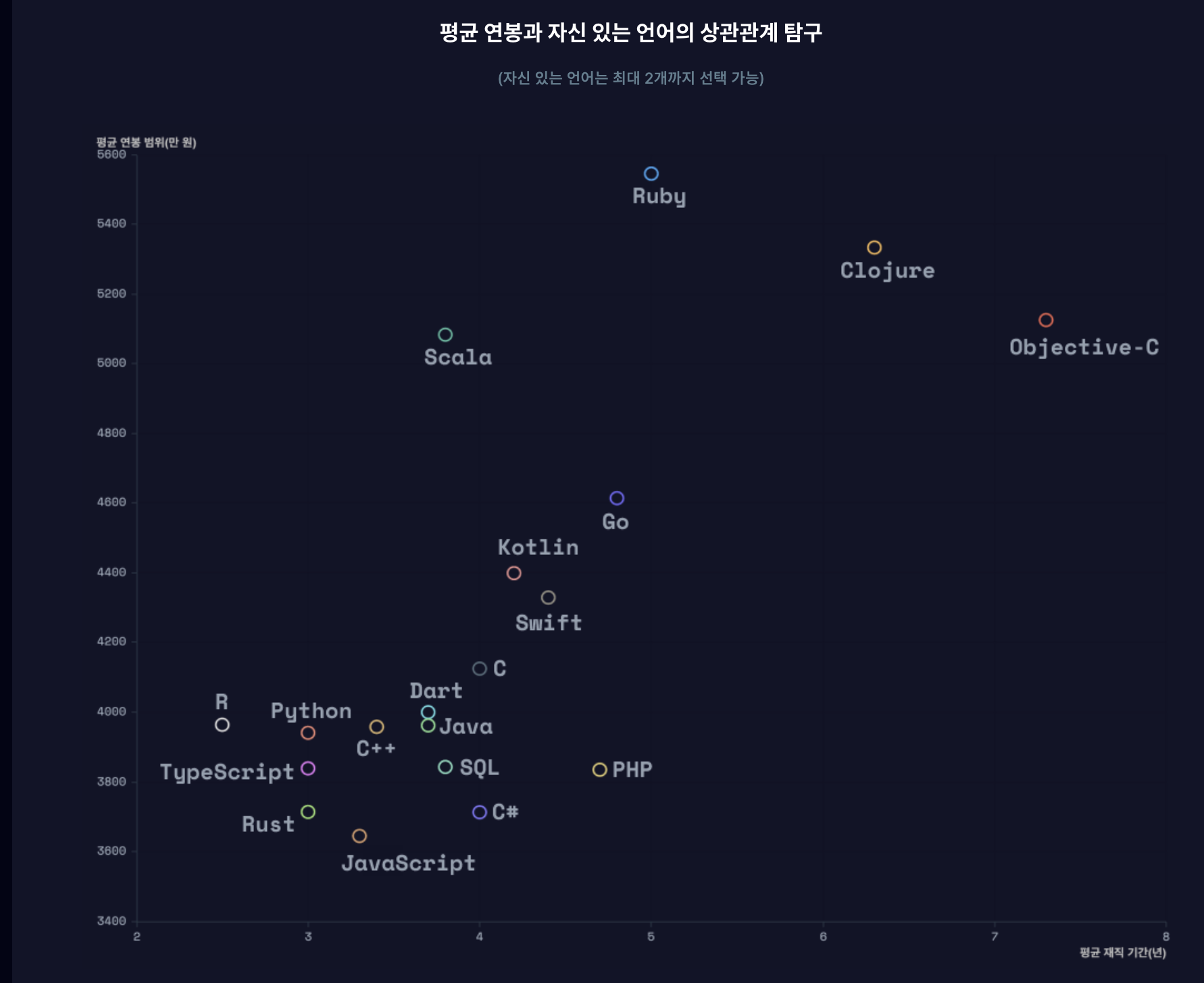 ๋ ๊ตฌ์ฒด์ ์ผ๋ก ์ดํด๋ณด๋ฉด Clojure ๋ฅผ "๊ฐ์ฅ ์์ ์๋ ์ธ์ด"๋ก ์๋ตํ ์ฌ๋์ ์ธ ๋ช ๋ฐ์ ์์๋ ๊ฒ์ผ๋ก ๋ณด์ด๋๋ฐ, ์ด๋ค์ ํ๊ท ์ฐ๋ด์ ๋ฐ์ํ์ฌ ๋ฐ์ดํฐ๋ฅผ ์๊ฐํํ๋๊ฒ ๋ง๋? ์๋ฌธ์ด ์๊ฒผ๋ค. ์์ ์ด๋ฌํ ์ธ์ด๋ฅผ ์์๋ผ์ด์ด๋ก ์ฒ๋ฆฌํ๋ ๊ฒ์ด ๋์ ๋ฐฉ๋ฒ์ด์์ ๊ฒ์ด๋ผ๊ณ ์๊ฐํ๋ค. (๋ฌผ๋ก ์ด๋๊น์ง๋ ๊ฐ์ธ์ ์ธ ์๊ฒฌ์ด๋ฉฐ, ๋ชจ๋ ๋ฐ์ดํฐ๋ฅผ ์๊ฐํํ ์๋๋ ๋ถ๋ช ์์ ๊ฒ์ด๋ค)