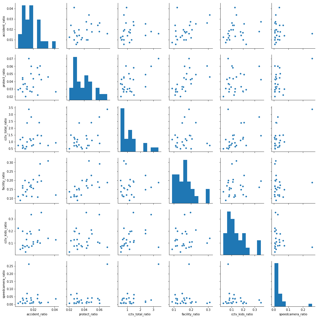 ํต๊ณ๋ถ์ ๊ฒฐ๊ณผ, ์ด๋ฆฐ์ด ๊ตํต์ฌ๊ณ ๋ฐ์ ๋น์จ๊ณผ ์๊ด๊ด๊ณ๊ฐ ๋์ ๋ณ์๋ (๊ทธ๋๋ง) ์ด๋ฆฐ์ด์์ค์ด์๋ค. ๊ทธ๋ฐ๋ฐ ํน์ดํ ์ ์, ์ด๋ฆฐ์ด์์ค๊ณผ ์ด๋ฆฐ์ด ๊ตํต์ฌ๊ณ ๋ฐ์๋น์จ์ ์๊ด๊ณ์๋ 0.5์ ์ด๋ฅด๋๋ฐ, ์ด๋ฆฐ์ด์์ค๊ณผ CCTV ๊ฐ์์ ์๊ด๊ณ์๋ ๋งค์ฐ ๋ฎ๋ค๋ ์ ์ด์๋ค. ๋ง์ฝ ์๊ด๊ณ์ ๊ฐ๋ค์ด ๋๊ทน๋จ์ ์ผ๋ก ๋ถํฌ๋์๋๋ผ๋ฉด, "์ด๋ฆฐ์ด ์ฌ๊ณ ๋ฅผ ์๋ฐฉํ๊ธฐ ์ํด์ ์ด๋ฆฐ์ด์์ค์ด ๋ง์ ์ง์ญ์ CCTV๋ ๋ง์ด ์ค์นํด์ผํ๋ค"๋ ๊ฒฐ๋ก ์ ๋์ถํ ์ ์์์ํ ๋ฐ, ์ด๋ฌํ ํด์์ ์ด๋์ด๋ผ๋งํผ ๊ฐํ ์๊ด๊ณ์ ๊ฐ์ด ์๋๋ผ ์์ฝ๊ธฐ๋ ํ๋ค.