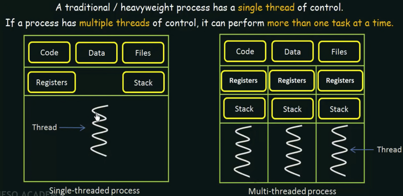 κ·Έλ¦¬κ³ μ€λ λ(Thread)λ νλ‘μΈμ€ λ΄μμ μ€νλλ μ¬λ¬ νλ¦μ λ¨μμ΄λ©°, νλ‘μΈμ€κ° ν λΉλ°μ μμ€ν μμ (CPU μκ°, λ©λͺ¨λ¦¬ μμ λ±)μ μ΄μ©νλ μ€ν λ¨μμ΄λ€.